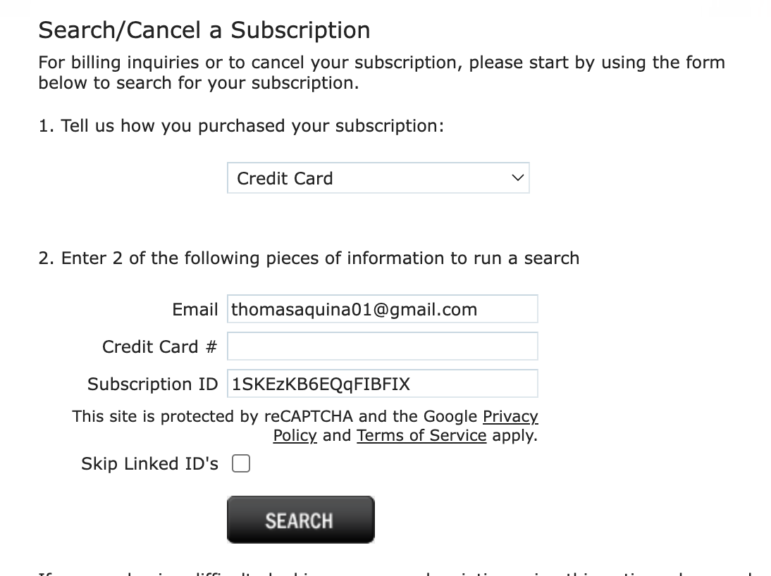 To cancel fill in your payment method and 2 pieces of identifying information. We recommend using your email and the subscription ID you recieved by email when you first signed up.